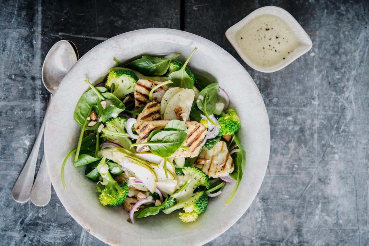 5. Serveer de jonge spinazie met de broccoli, ajuin, stukjes peer en gegrilde berloumi en de vinaigrette. Werk af met geroosterde amandelen.