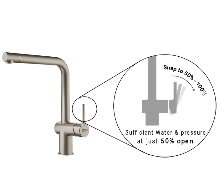 Ο μοχλός της βρύσης είναι κλιμακωτός, οπότε με μία κίνηση ανοίγει 50%, παρέχοντας άφθονο νερό με αρκετή πίεση και σε κατάλληλη θερμοκρασία για να ταιριάζει στις περισσότερες εργασίες, είτε γεμίζετε την κατσαρόλα με νερό , είτε πλένετε τα πιάτα.