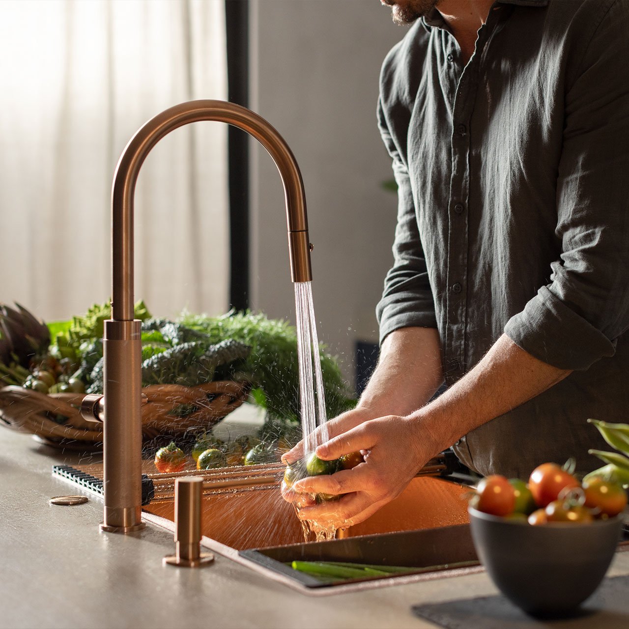 Il nuovo miscelatore MYTHOS MASTERPIECE DOCCIA è il completamento ideale per una cucina funzionale e, allo stesso tempo, piena di stile e charme. Nella finitura PVD COPPER si abbina perfettamente alle vasche con accessori e complementi della collezione Masterpiece, ma anche alla vostra vasca integrata, creando un'estetica armoniosa e avvolgente. La doccetta a doppio getto è efficace per lavare anche lo sporco più ostinato e per raggiungere con facilità qualsiasi punto della vasca, assicurando la massima comodità.