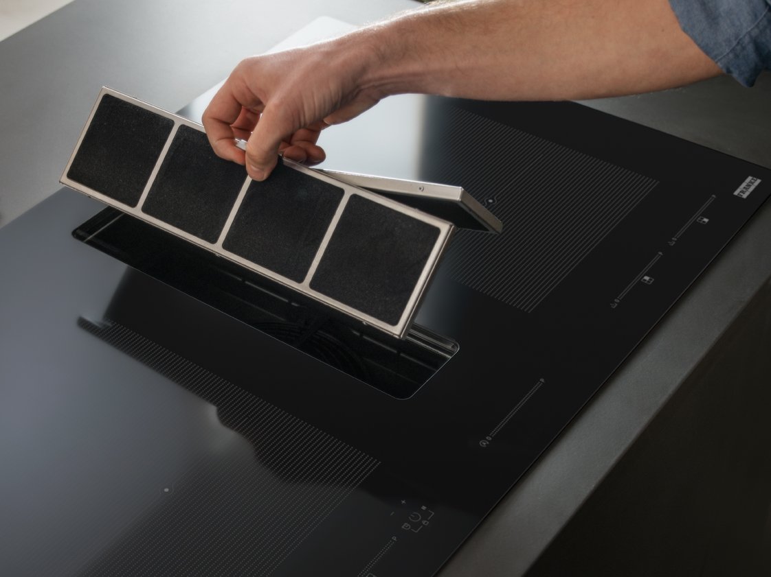 Угольный фильтр теперь можно извлечь сверху, через решетку зоны захвата воздуха. Что облегчает процесс ухода за вытяжкой.
