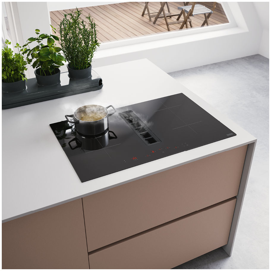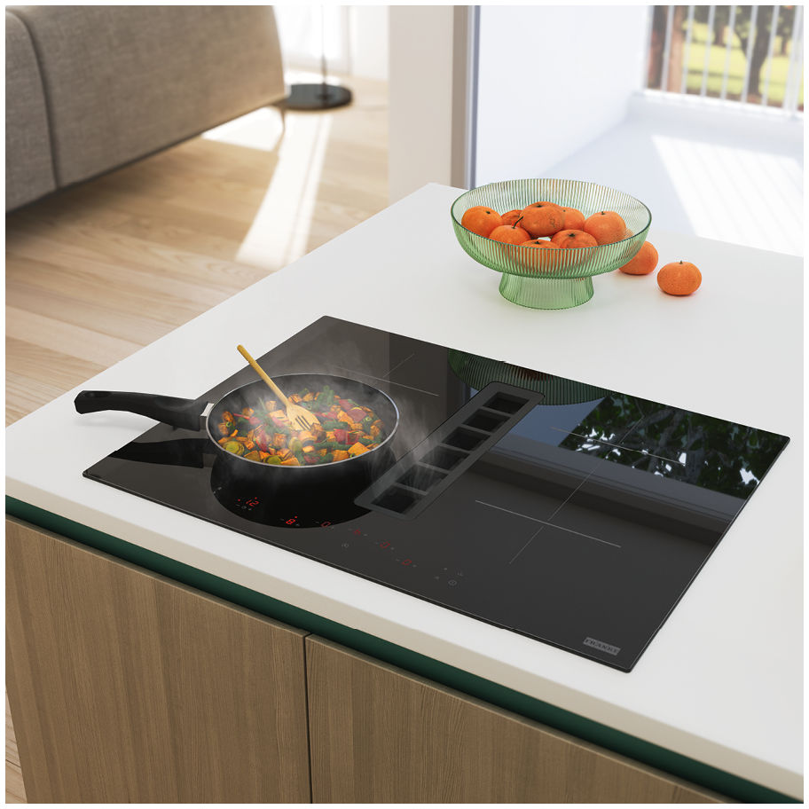 Завдяки комбінованій варильній поверхні та витяжці на кухні з'являється більше простору, що дозволяє зручно готувати страви та насолоджуватися ергономікою, експериментуючи з новими рецептами разом з родиною та друзями.
